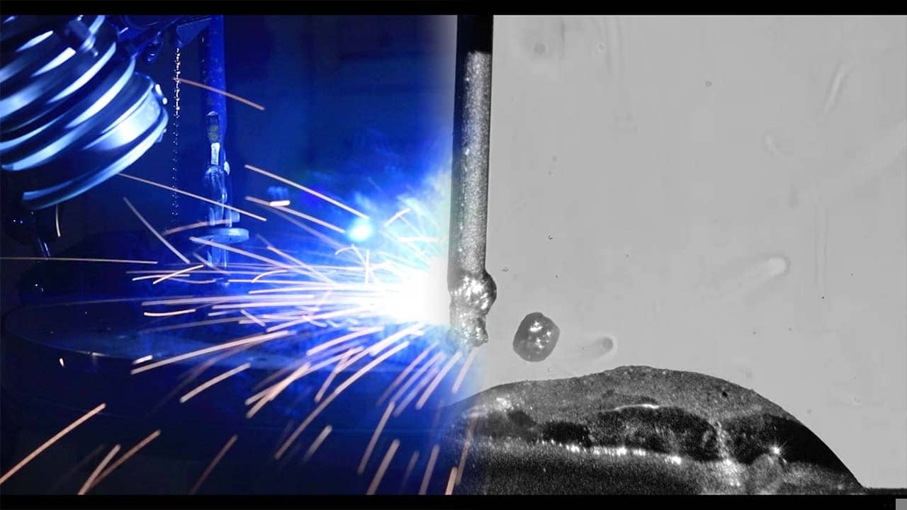 Slow motion of a flux coated electrode hand welding process visualized with CAVILUX laser illumination.